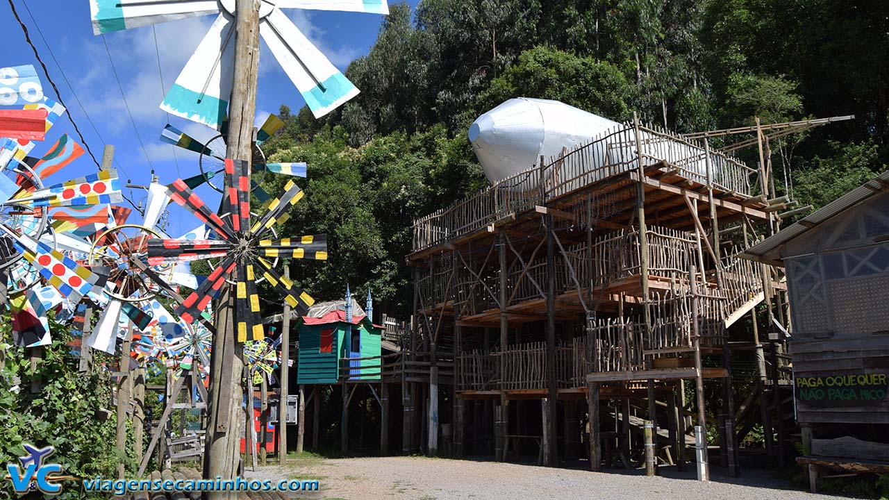No início ele começou a fazer cataventos, depois pensou em algo maior e vem aumentando a cada dia. No local há miniaturas, um labirinto, um mirante, uma trilha suspensa em meio à mata, tudo em madeira.