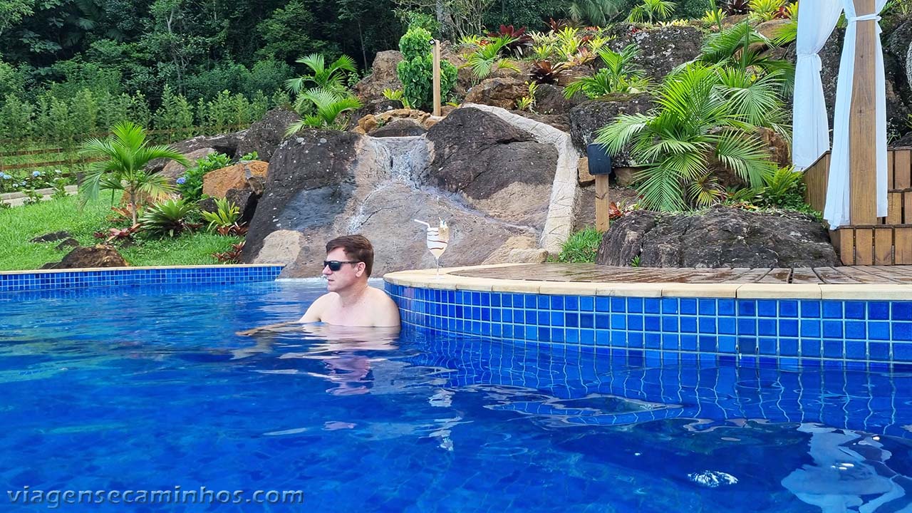 As suítes possuem banheira de hidromassagem e varanda com vista para a floresta ou cidade. Já a incrível piscina aquecida e de borda infinita proporciona vista do vale, com o bar e restaurante ao lado.