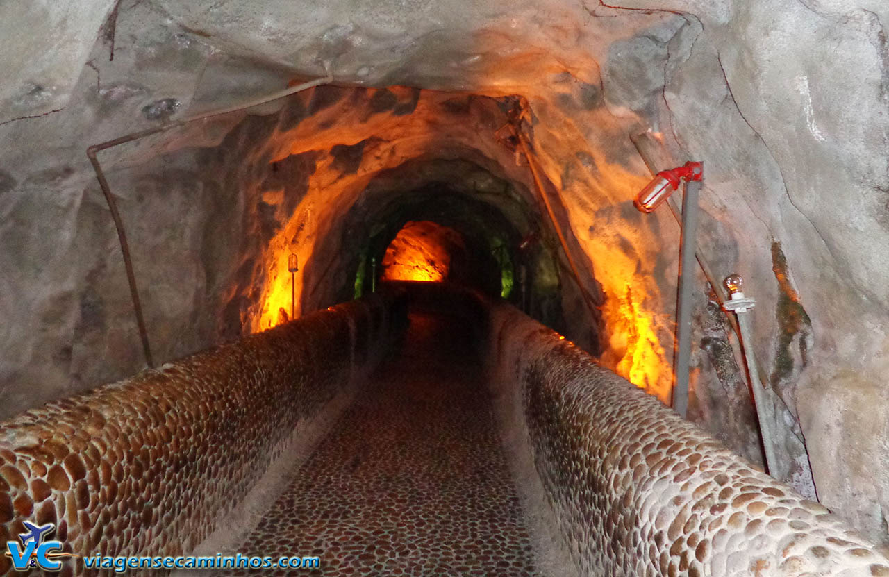Depois fomos até o mirante com vistas para as comportas, ponte e do cânion, e em seguida entramos por um túnel por baixo da represa que leva até um mirante das turbinas.